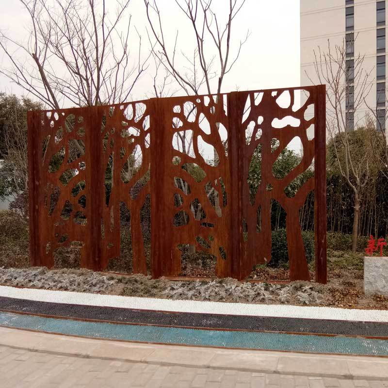 耐候鋼樹池耐候鋼板景墻,鋼板切割景觀墻。耐候鋼形體塑造能力強,而且銹紅耐候鋼鋼板會